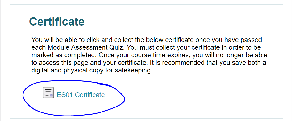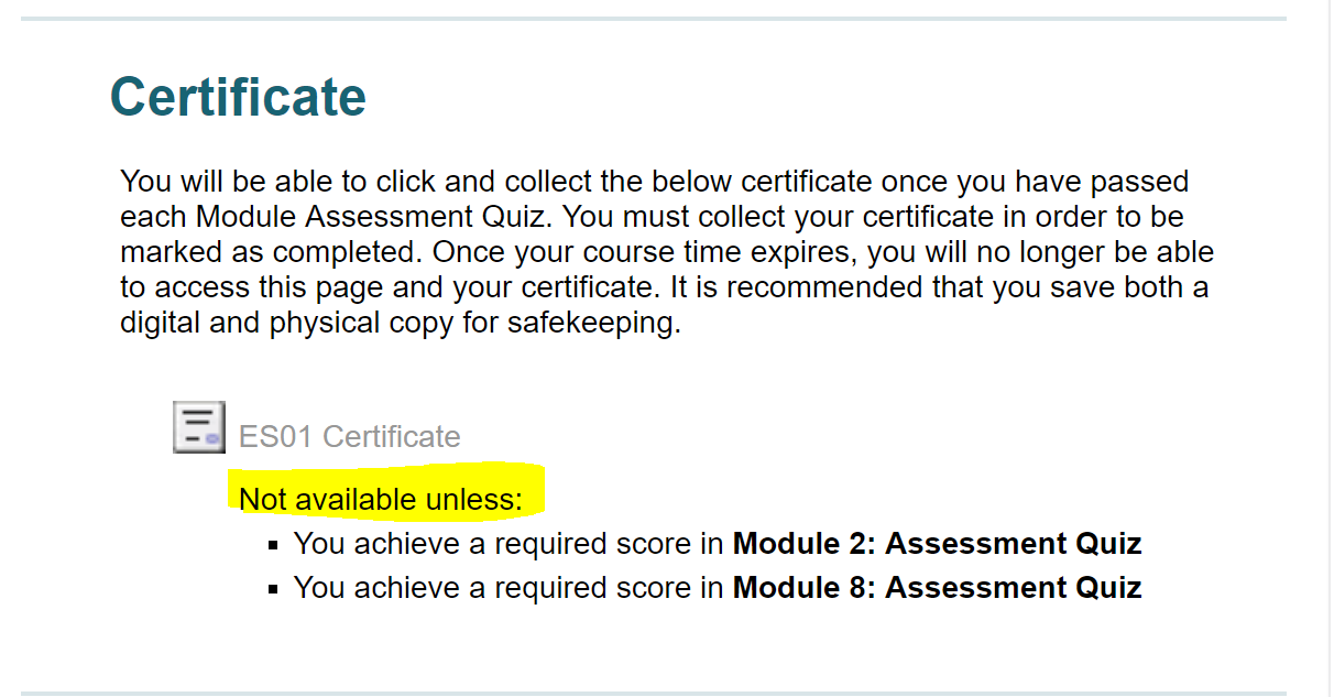 Once you have met the conditions for completion, your certificate will be accessible by clicking on the Certificate link. Your certificate will be displayed on screen; and you can save it to your local computer for future reference or print it.
