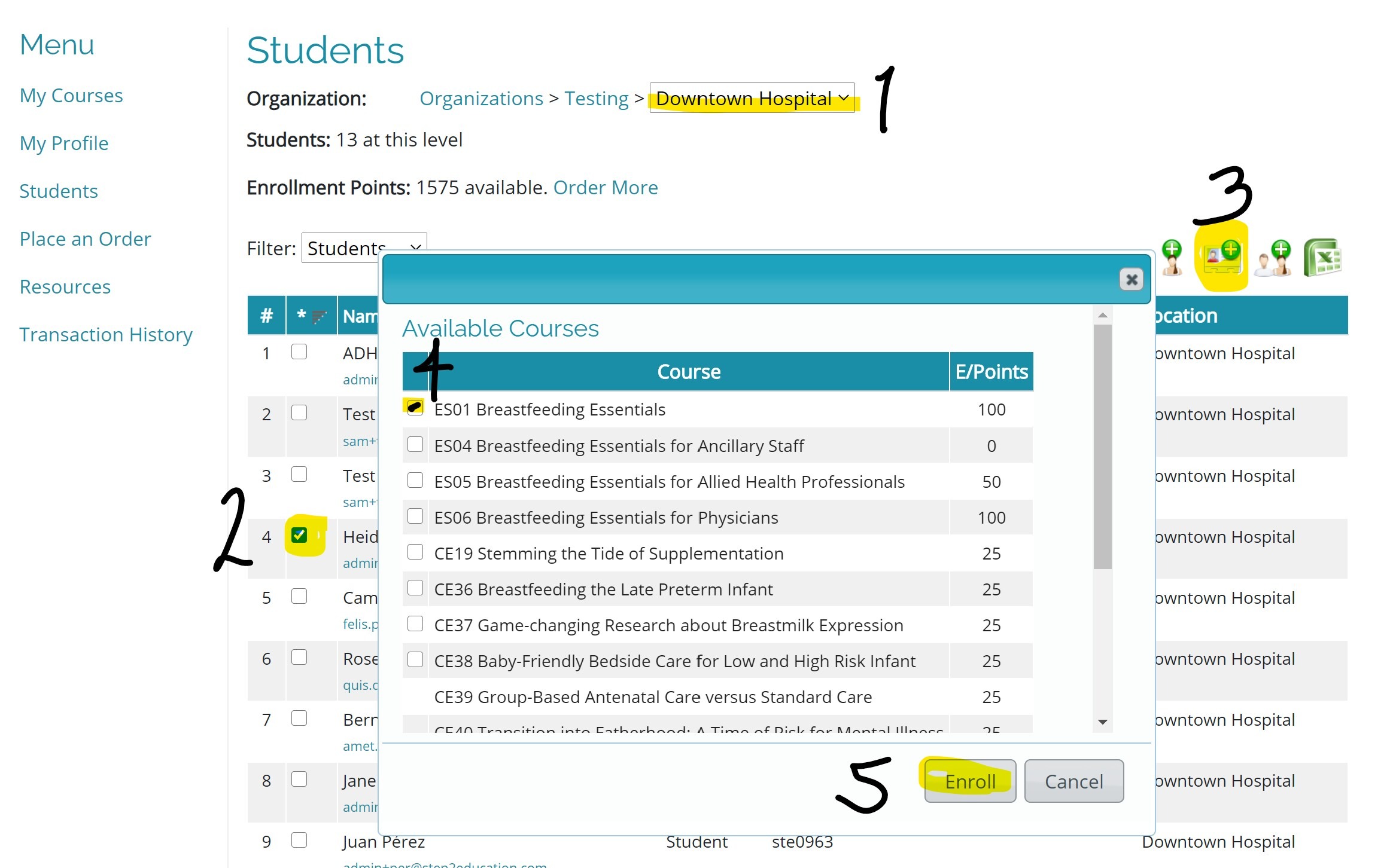 . This will bring up the course list. - Click the checkbox next to the course you want to enroll them in.