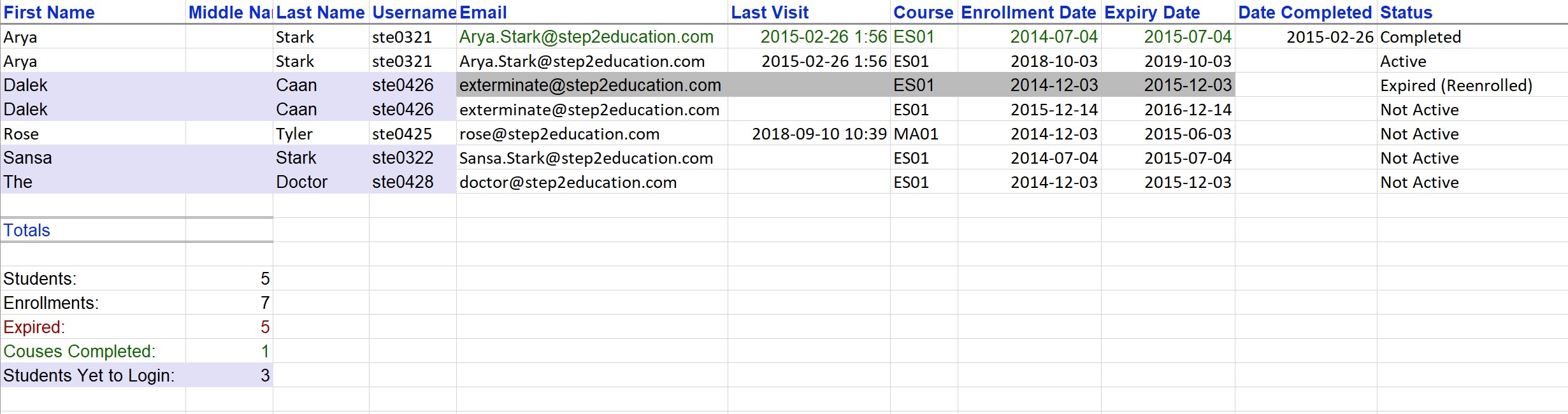 Course enrollment time varies, depending on the course the student is enrolled in. Our Essential courses, ES01->ES06 have a 12-month enrollment time. Course time starts from the day of enrollment (not when a student first logs in). Their enrollment date, and expiry date are both listed in the report in the format yyyy-mm-dd.