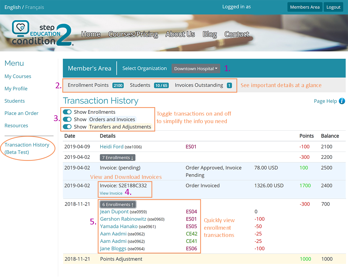 Transaction History helps you manage your orders, invoices, and even see who and when staff are enrolled.